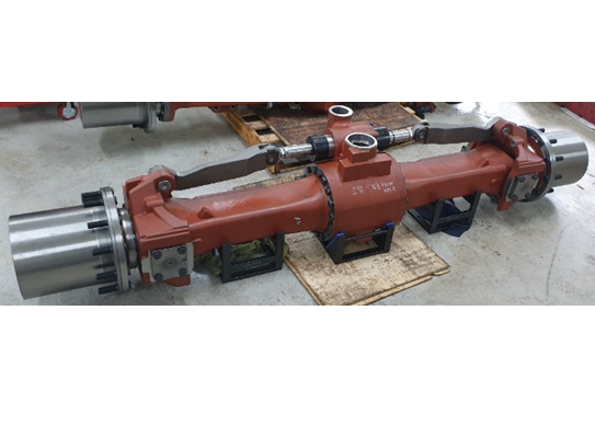 · 제품개요 : 동력전달 핵심 부품 중 하나로 액슬은 휠 굴착기의 하중을 지지해주고, 트랜스미션으로부터 전달되는 토크를 바퀴로 분배하여 굴착기의 방향과 속도, 브레이킹 하기 위한 장치임. 14~21톤급 휠 굴착기용 전/후륜 액슬은 작업성 및 구동력 향상을 위하여 사륜구동(4WHEEL DRIVE)방식을 채용하고 있음. 전/후 액슬은 지면으로부터의 충격과 진동 및 굴착기 상부체 하중을 충분히 지지하고 구동력을 전달하는 강도를 충분히 확보해야 하며, 동력조향장치 구성부품인 조향실린더가 전륜 액슬에 부착되는 구조를 갖음. 전륜 액슬에는 조향과 구동 작동을 동시에 수행하기 위한 킹핀, 너클, 유니버셜조인트와 휠 굴착기의 중량을 지탱하는 케이싱, 차동장치, 유압식 습식 다판형 주행브레이크로 구성되며 조향실린더가 일체로 장착되어 있음. 후륜 액슬은 휠 굴착기의 중량을 지탱하는 케이싱, 차동장치, 유압식 습식 다판형 주행브레이크로 구성되어 있음.